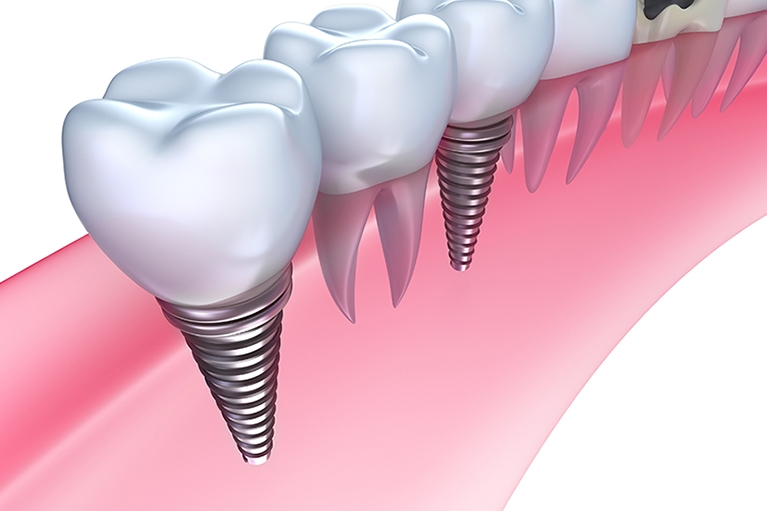 インプラントは、失った歯1本より全歯までを補うことができる、人工の歯根を埋め込んで、その上に人工歯を装填する治療法です。顎に人工歯根を埋め込む手術が必要となりますが、ご自身の顎にしっかりと固定されるため、ご自身の歯とほとんど変わらない嚙み心地や見た目を取り戻せることが最大のメリットだといえるでしょう。